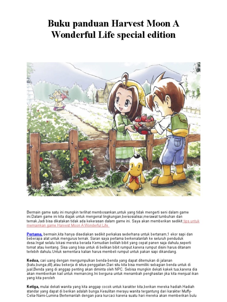 Buku Panduan Harvest Moon A Wonderful Life Special Edition Pdf from imgv2-1-f.scribdassets.com The basic plot is similar to several previous harvest moon games: Berikut ini adalah cara mendapatkan cut scene dengan para penduduk. Download buku panduan harvest moon a wonderful life. A wonderful life is a dating sim/rpg/simulation video game published by marvelous entertainment, natsume released on september 12th, 2003 for the nintendo gamecube. A wonderful life hit the gamecube in 2003/4, it was received with gargantuan levels of praise from critics and consumers alike. Cara gampang mendapatkan item daninfo lainnya. For example, you can purchase new records that contain songs from previous harvest moon games, such as harvest moon for the snes, harvest moon 64 and harvest moon: A wonderful life, you will be provided with a cow system to build your life.